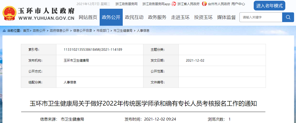 玉環(huán)市衛(wèi)生健康局關(guān)于做好2022年傳統(tǒng)醫(yī)學(xué)師承和確有專長人員考核報名工作的通知