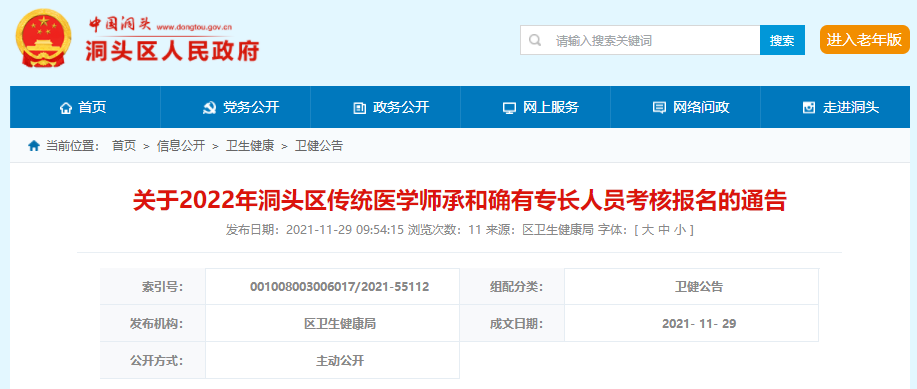 附件:浙江省中醫(yī)藥管理局關(guān)于做好2022年傳統(tǒng)醫(yī)學(xué)師承和確有專長(zhǎng)人員考核報(bào)名工作的通知(http://www.dongtou.gov.cn/art/2021/11/29/art_1229516962_59047927.html)