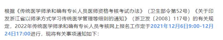 根據(jù)《傳統(tǒng)醫(yī)學(xué)師承和確有專長人員醫(yī)師資格考核考試辦法》(衛(wèi)生部令第52號)《關(guān)于印發(fā)浙江省以師承方式學(xué)習(xí)傳統(tǒng)醫(yī)學(xué)管理等細(xì)則的通知》(浙衛(wèi)發(fā)〔2008〕117號)的有關(guān)規(guī)定,2022年傳統(tǒng)醫(yī)學(xué)師承和確有專長人員考核網(wǎng)上報名工作定于2021年12月6日9:00-12月24日17:00進(jìn)行,現(xiàn)將有關(guān)事項(xiàng)通知如下:
