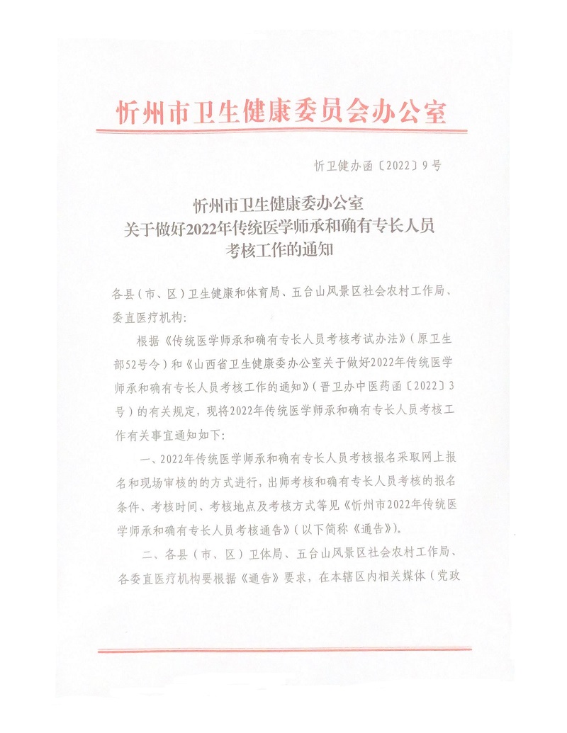 忻州市衛(wèi)生健康委辦公室關(guān)于做好2022年傳統(tǒng)醫(yī)學(xué)師承和確有專長(zhǎng)人員考核工作的通知
