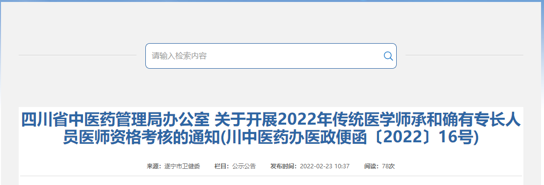 四川省中醫(yī)藥管理局辦公室關(guān)于開展2022年傳統(tǒng)醫(yī)學(xué)師承和確有專長人員醫(yī)師資格考核的通知(川中醫(yī)藥辦醫(yī)政便函〔2022〕16號)