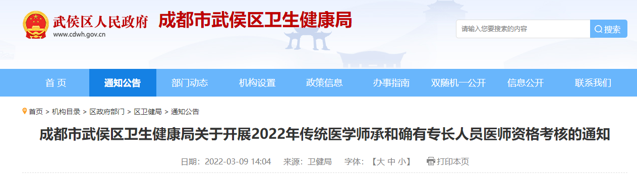 成都市武侯區(qū)衛(wèi)生健康局關(guān)于開展2022年傳統(tǒng)醫(yī)學(xué)師承和確有專長人員醫(yī)師資格考核的通知