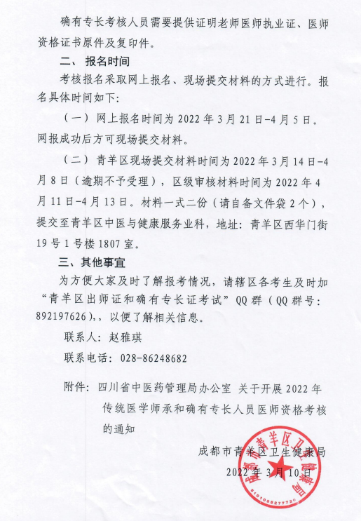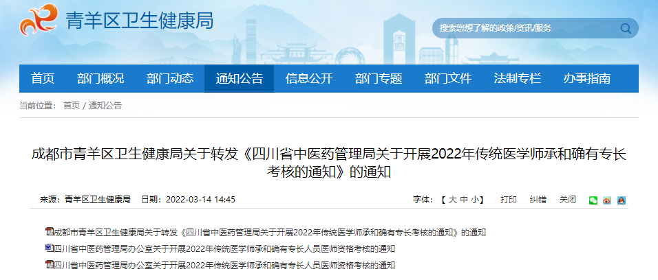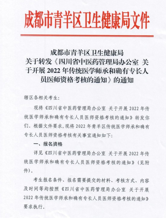 成都市青羊區(qū)衛(wèi)生健康局關(guān)于轉(zhuǎn)發(fā)《四川省中醫(yī)藥管理局關(guān)于開(kāi)展2022年傳統(tǒng)醫(yī)學(xué)師承和確有專(zhuān)長(zhǎng)考核的通知》的通知