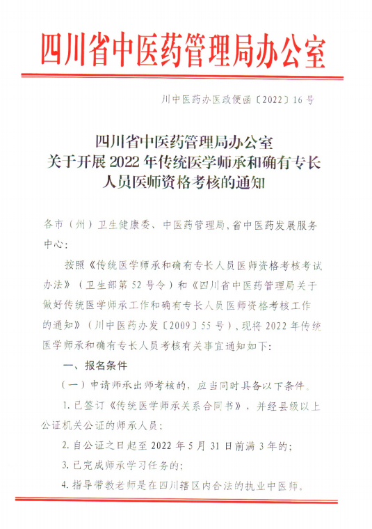 附件2:四川省中醫(yī)藥管理局辦公室關(guān)于開(kāi)展2022年傳統(tǒng)醫(yī)學(xué)師承和確有專(zhuān)長(zhǎng)人員醫(yī)師資格考核的通知