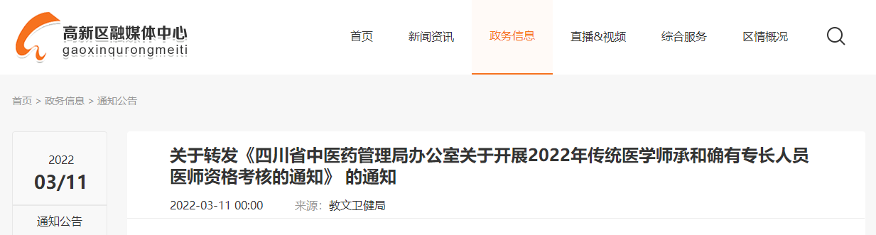 現將《四川省中醫(yī)藥管理局辦公室關于開展2022年傳統(tǒng)醫(yī)學師承和確有專長人員醫(yī)師資格考核的通知》(川中醫(yī)藥辦醫(yī)政便函〔2022〕16號,以下簡稱《通知》)轉發(fā)你們,請各單位髙度重視,認真學習,遵照執(zhí)行。同時,為進一步做好高新區(qū)傳統(tǒng)醫(yī)學師承和確有專長人員醫(yī)師資格考核工作,我局特委托成都高新醫(yī)學會負責相關事宜,具體通知如下: