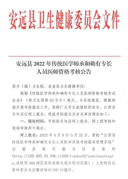 根據(jù)《關(guān)于做好2022年傳統(tǒng)醫(yī)學(xué)師承和確有專(zhuān)長(zhǎng)人員醫(yī)師資格考核考試有關(guān)工作的通知》(贛市衛(wèi)健中醫(yī)字