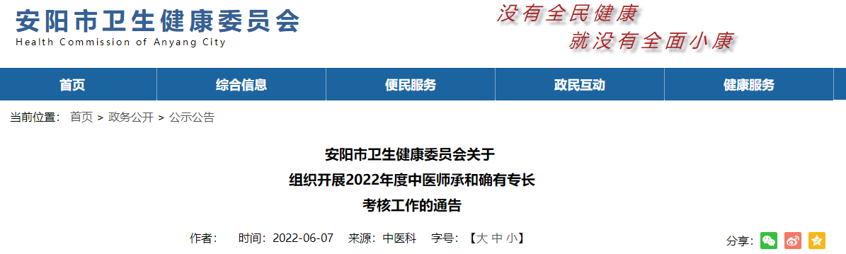 河南省安陽市衛(wèi)生健康委員會(huì)關(guān)于組織開展2022年度中醫(yī)師承和確有專長考核工作的通告