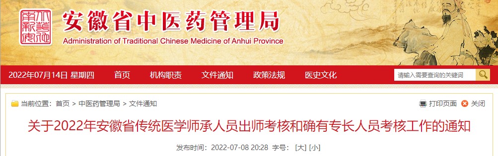 根據(jù)《傳統(tǒng)醫(yī)學(xué)師承和確有專長人員醫(yī)師資格考核考試辦法》(原衛(wèi)生部令第52號)、《安徽省傳統(tǒng)醫(yī)學(xué)師承和確有專長人員醫(yī)師資格考核考試工作方案》(衛(wèi)中醫(yī)藥秘〔2011〕68號)等相關(guān)文件要求,現(xiàn)就2022年安徽省傳統(tǒng)醫(yī)學(xué)師承人員出師考核和確有專長人員考核工作具體事宜通知如下: