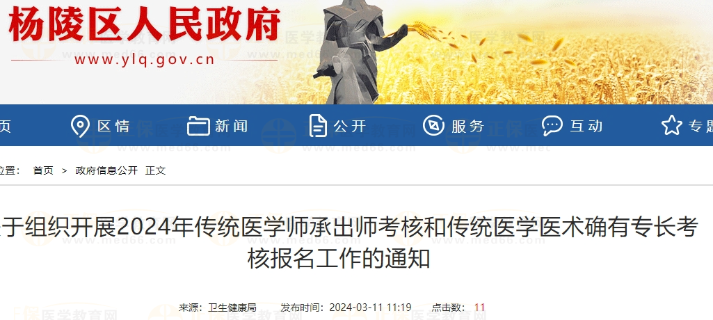 陜西省咸陽市楊陵區(qū)2024年傳統(tǒng)醫(yī)學(xué)師承出師考核和傳統(tǒng)醫(yī)學(xué)醫(yī)術(shù)確有專長考核報(bào)名工作的通知已發(fā)布,申請參加考核人員,2024年3月11日——3月31日通過“陜西省中醫(yī)藥發(fā)展服務(wù)中心”網(wǎng)站急性報(bào)名,醫(yī)學(xué)教育網(wǎng)小編為大家整理官方通知如下:
