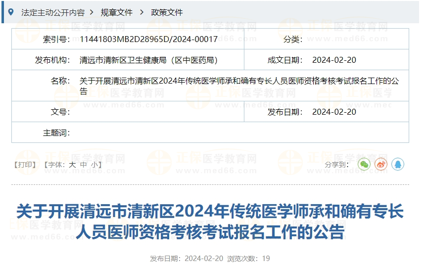 關于開展清遠市清新區(qū)2024年傳統(tǒng)醫(yī)學師承和確有專長人員醫(yī)師資格考核考試報名工作的公告