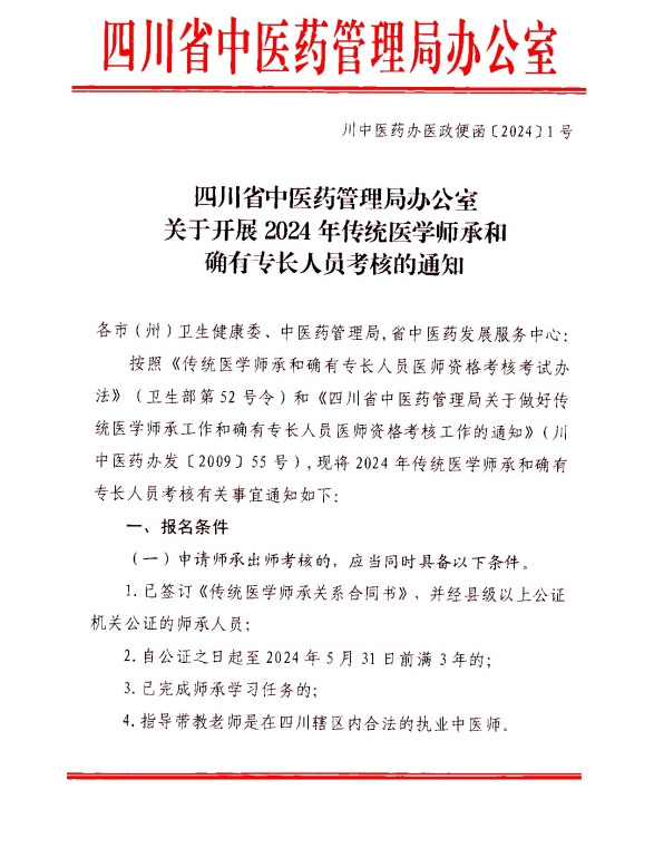 附件下載:四川省中醫(yī)藥管理局辦公室關(guān)于開展2024年傳統(tǒng)醫(yī)學(xué)師承和確有專長(zhǎng)人員考核的通知