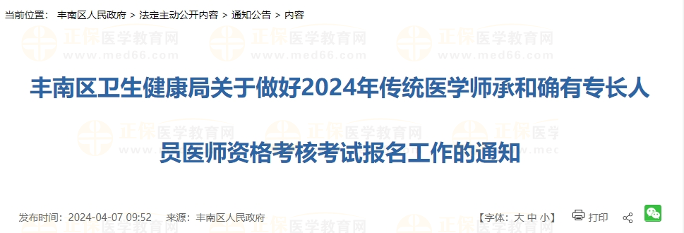 豐南區(qū)衛(wèi)生健康局關(guān)于做好2024年傳統(tǒng)醫(yī)學(xué)師承和確有專(zhuān)長(zhǎng)人員醫(yī)師資格考核考試報(bào)名工作的通知
