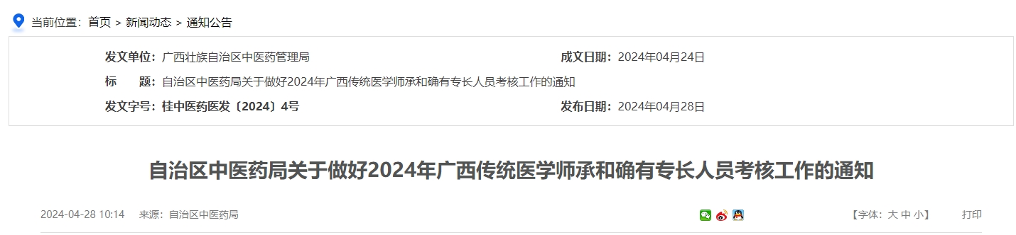 自治區(qū)中醫(yī)藥局關(guān)于做好2024年廣西傳統(tǒng)醫(yī)學(xué)師承和確有專長人員考核工作的通知
