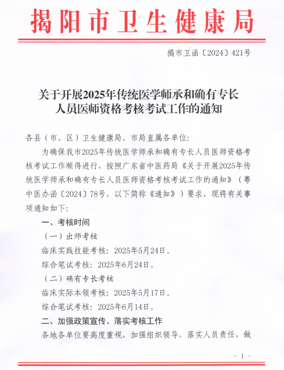 廣東省揭陽市2025年傳統(tǒng)醫(yī)學師承和確有專長人員醫(yī)師資格考核考試通知已發(fā)布,醫(yī)學教育網(wǎng)整理通知如下: