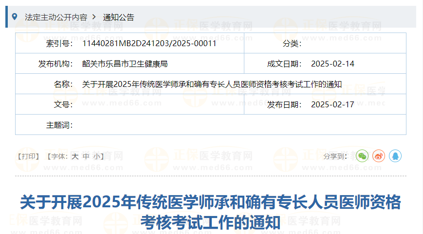 廣東省韶關(guān)樂昌市2025年傳統(tǒng)醫(yī)學師承和確有專長人員醫(yī)師資格考核考試通知已發(fā)布,請申報人持有效身份證件,攜帶規(guī)定的材料,于2025年3月21日前到樂昌市衛(wèi)生健康局(中醫(yī)股)辦理申報,逾期不再受理。醫(yī)學教育網(wǎng)整理官方通知如下: