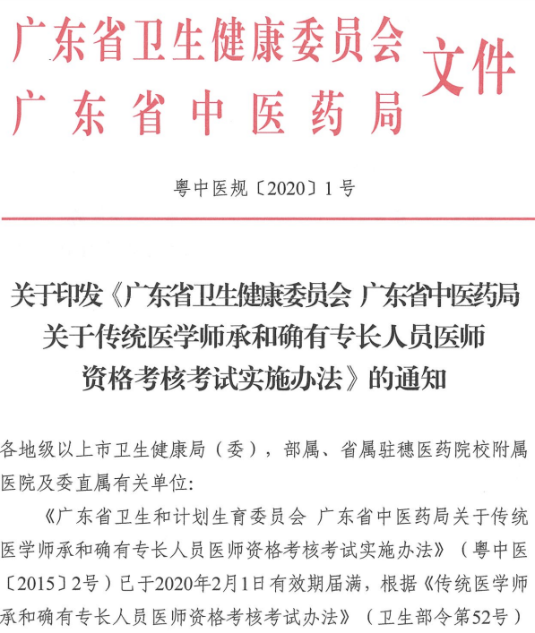 關(guān)于印發(fā)《廣東省衛(wèi)生健康委員會+廣東省中醫(yī)藥局關(guān)于傳統(tǒng)醫(yī)學(xué)師承和確有專長人員醫(yī)師資格考核考試實(shí)施辦法》的通知已發(fā)布,醫(yī)學(xué)教育網(wǎng)編輯為您整理相關(guān)通知內(nèi)容如下: