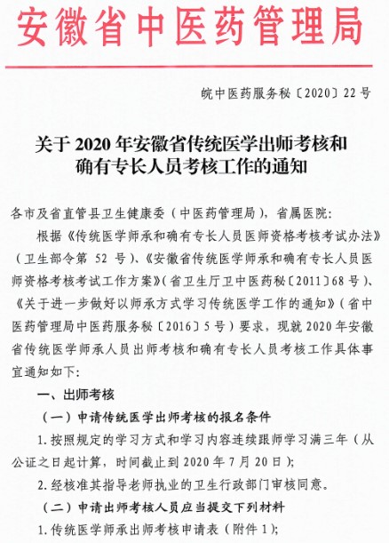 關于2020年安徽省傳統(tǒng)醫(yī)學出師考核和確有專長人員考核工作的通知(皖中醫(yī)藥服務秘2020-22號)