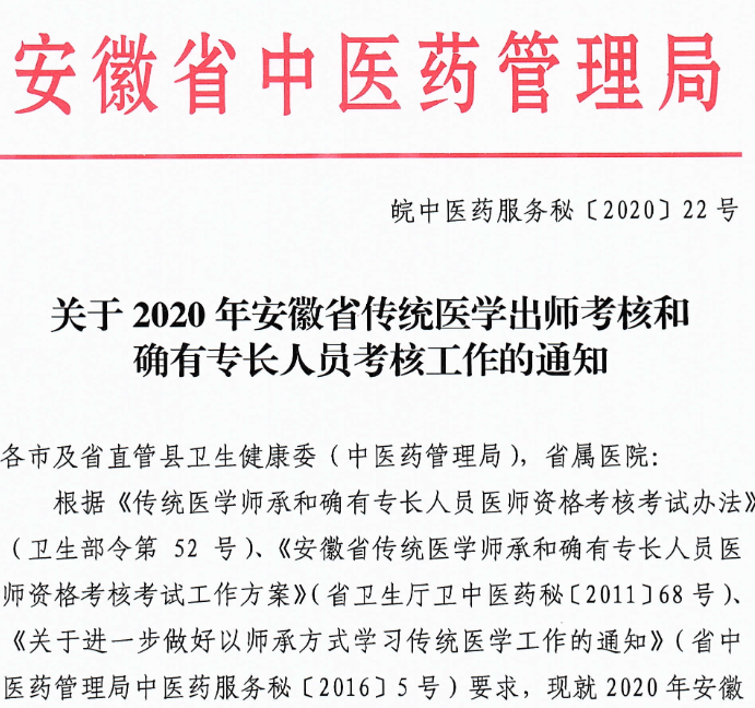 關(guān)于2020年安徽省傳統(tǒng)醫(yī)學(xué)出師考核和確有專長人員考核工作的通知(皖中醫(yī)藥服務(wù)秘2020-22號(hào)).pdf.pdf