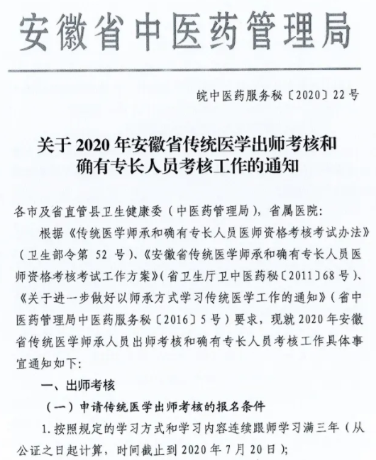查看原文:關(guān)于2020年安徽省傳統(tǒng)醫(yī)學(xué)出師考核和確有專長人員考核工作的通知(皖中醫(yī)藥服務(wù)秘2020-22號)
