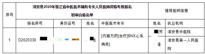 根據(jù)《浙江省中醫(yī)藥管理局關(guān)于做好2020年浙江省中醫(yī)醫(yī)術(shù)確有專長(zhǎng)人員醫(yī)師資格考核報(bào)名工作的通知》(浙中醫(yī)藥〔2020〕5號(hào))規(guī)定,經(jīng)過(guò)網(wǎng)上報(bào)名、現(xiàn)場(chǎng)資料審核,現(xiàn)將2020年浙江省中醫(yī)醫(yī)術(shù)確有專長(zhǎng)人員醫(yī)師資格考試淳安縣初審?fù)ㄟ^(guò)人員進(jìn)行公示,公示期:2020年8月24日-2020年9月1日(7個(gè)工作日)。
