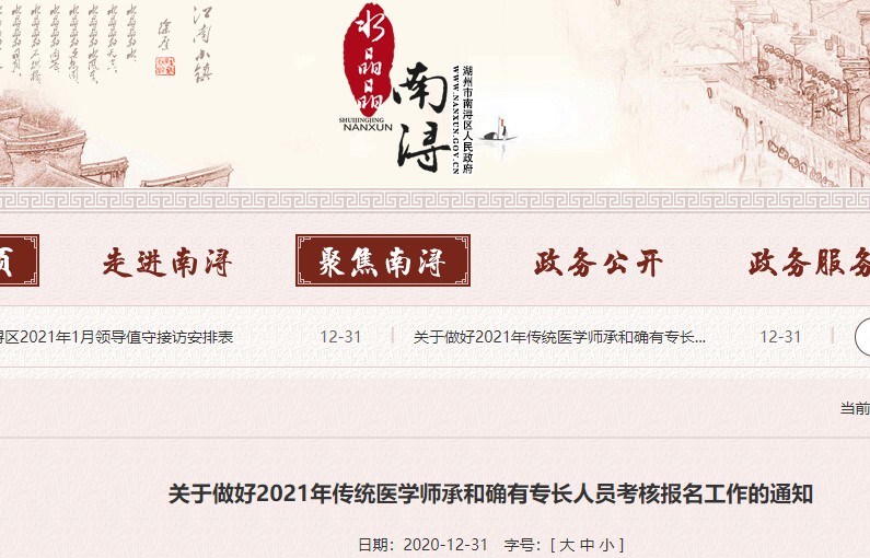 湖州市南潯區(qū)2021年傳統(tǒng)醫(yī)學師承和確有專長人員考核報名通知已發(fā)布,根據(jù)《浙江省2021年傳統(tǒng)醫(yī)學師承和確有專長人員考核通告》要求,2021年傳統(tǒng)醫(yī)學師承和確有專長人員考核報名工作定于1月18日9:00-2月8日17:00進行,現(xiàn)通知如下(具體事項詳見附件):