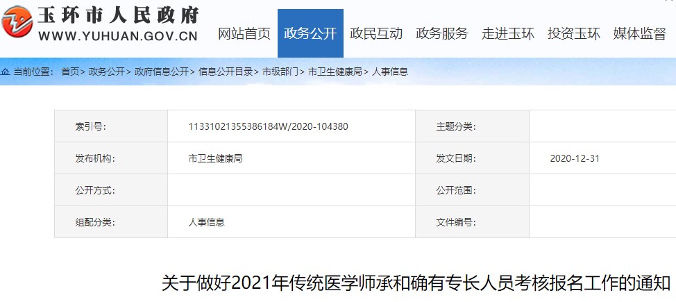 為做好我市2021年傳統(tǒng)醫(yī)學師承和確有專長人員考核報名工作,請各醫(yī)療衛(wèi)生單位根據(jù)《浙江省中醫(yī)藥管理局關于做好2021年傳統(tǒng)醫(yī)學師承和確有專長人員考核報名工作的通知》浙中醫(yī)藥〔2021〕14號文件要求及時通知本機構相關人員,各鄉(xiāng)鎮(zhèn)衛(wèi)生院通知轄區(qū)內各基層醫(yī)療機構人員(服務站、各類診所、村衛(wèi)生室),請符合申報條件的人員于2021年2月1日—2月4日期間,攜帶相關材料到玉環(huán)市衛(wèi)健局311辦公室進行現(xiàn)場審核確認,聯(lián)系電話:87232979。