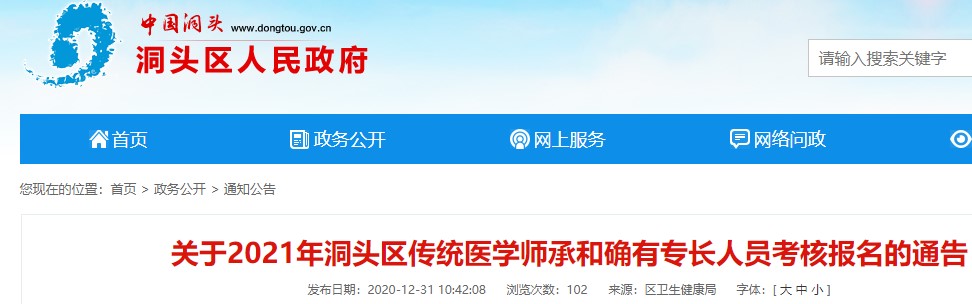 根據(jù)浙江省中醫(yī)藥管理局《關(guān)于做好2021年傳統(tǒng)醫(yī)學師承和確有專長人員考核報名工作的通知》(浙中醫(yī)藥[2020]14號),現(xiàn)就洞頭區(qū)有關(guān)報名事項通告如下: