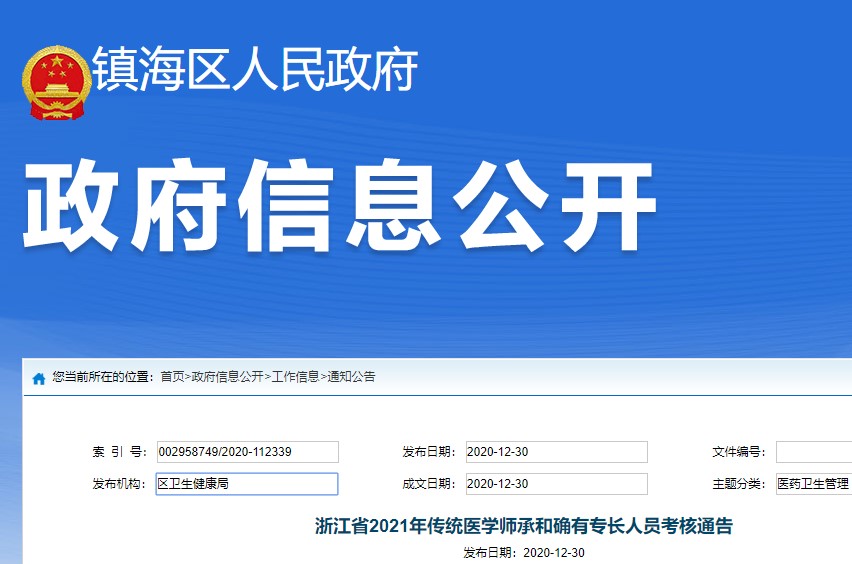 寧波鎮(zhèn)海區(qū)人民鎮(zhèn)府2021年傳統(tǒng)醫(yī)學師承和確有專長人員考核通告已發(fā)布,報名工作定于 2021年1月18日9:00-2月8日17:00進行?,F場審核確認時間:2021年1月18日—1月29日(工作日)。