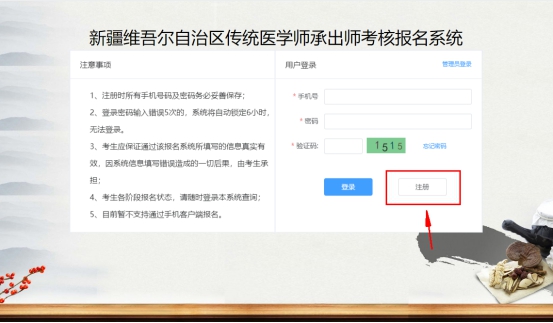 考生登錄新疆維吾爾自治區(qū)傳統(tǒng)醫(yī)學(xué)師承出師考核報名系統(tǒng)(https://zyks.xjqmjk.com/municipality-exam-client/traditional/index.html#/register)首頁找到本系統(tǒng)入口,建議使用最新版谷歌瀏覽器,低版本的瀏覽器或非主流瀏覽器將有可能無法正常使用本系統(tǒng)。