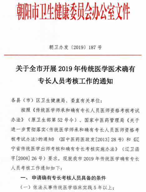 朝陽市衛(wèi)生健康委員會發(fā)布了《關(guān)于全市開展2019年傳統(tǒng)醫(yī)學醫(yī)術(shù)確有專長人員考核工作的通知》,醫(yī)學教育網(wǎng)小編相信很多考生都想知道,特地搜集整理了“遼寧朝陽市2019年傳統(tǒng)醫(yī)學醫(yī)術(shù)確有專長考核報名的通知”的內(nèi)容,詳情如下: