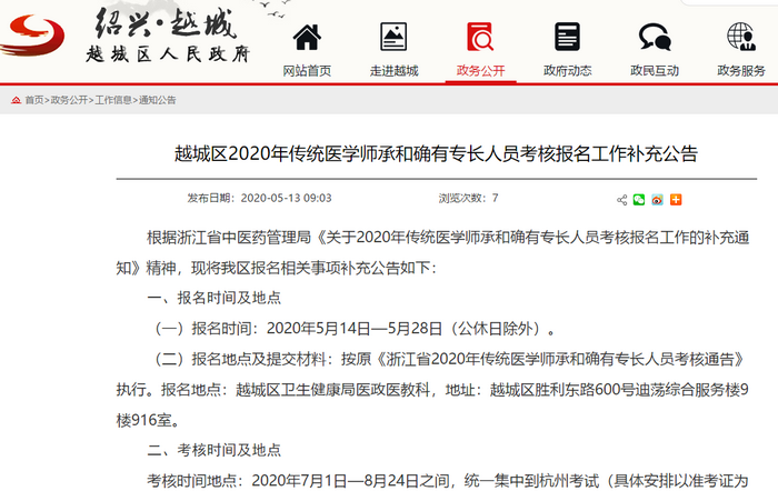紹興市越城區(qū)2020傳統(tǒng)醫(yī)學師承和確有專長人員考核報名的補充通知,具體通知內(nèi)容醫(yī)學教育網(wǎng)整理如下: