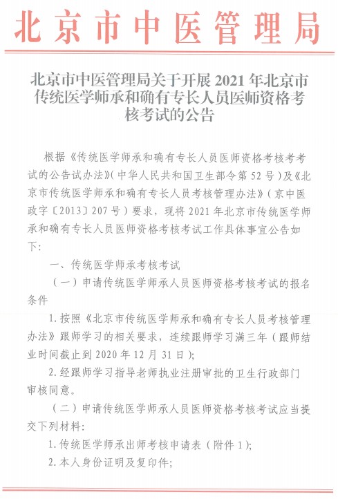 北京市中醫(yī)管理局關(guān)于開展2021年北京市傳統(tǒng)醫(yī)學(xué)師承和確有專長人員醫(yī)師資格考核考試的公告已發(fā)布。醫(yī)學(xué)教育網(wǎng)編輯為您整理2021年北京市傳統(tǒng)醫(yī)學(xué)師承和確有專長考試報(bào)名及考試重要信息內(nèi)容如下。