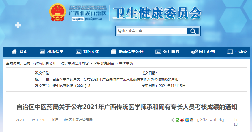 2021年廣西傳統(tǒng)醫(yī)學師承和確有專長人員考核成績(http://wsjkw.gxzf.gov.cn/xxgk_49493/fdzdgk/wsjszh/zyzy/t10795640.shtml)