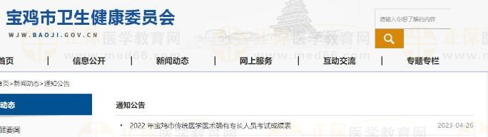 2022年陜西考區(qū)寶雞市傳統(tǒng)醫(yī)學(xué)醫(yī)術(shù)確有專長(zhǎng)人員考試成績(jī)表已發(fā)布,各位考生可進(jìn)入“寶雞市衛(wèi)生健康委員會(huì)-通知公告”進(jìn)入查看,醫(yī)學(xué)教育網(wǎng)老師為大家整理如下通知內(nèi)容: