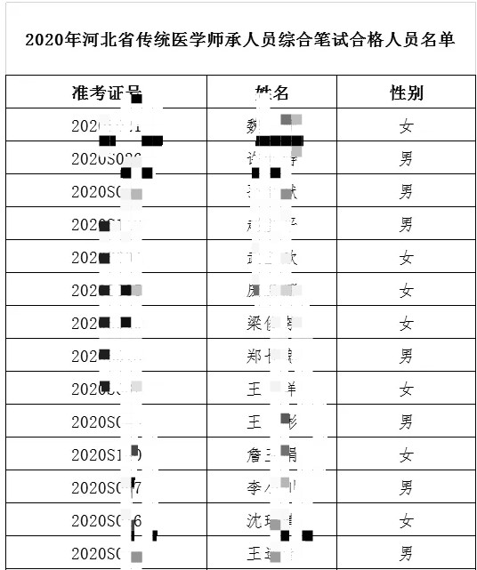 根據(jù)《傳統(tǒng)醫(yī)學(xué)師承和確有專長(zhǎng)人員醫(yī)師資格考核考試辦法》(衛(wèi)生部令第52號(hào))、《河北省衛(wèi)生廳關(guān)于印發(fā)河北省傳統(tǒng)醫(yī)學(xué)師承和確有專長(zhǎng)人員醫(yī)師資格考核考試實(shí)施細(xì)則的通知》(冀衛(wèi)中〔2012〕17號(hào))有關(guān)規(guī)定,省中醫(yī)藥管理局組織了2020年傳統(tǒng)醫(yī)學(xué)和確有專長(zhǎng)人員筆試,現(xiàn)將合格名單公布如下: