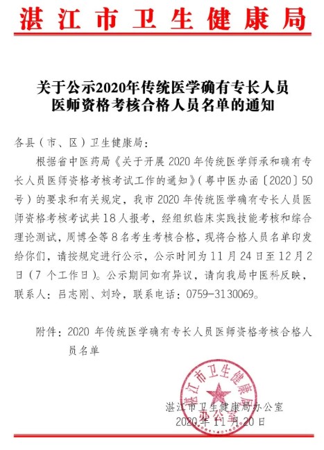 湛江市關(guān)于2020年傳統(tǒng)醫(yī)學(xué)確有專長人員醫(yī)師資格考核合格人員名單的公示已發(fā)布,醫(yī)學(xué)教育網(wǎng)編輯為大家搜集整理相關(guān)通知內(nèi)容如下。