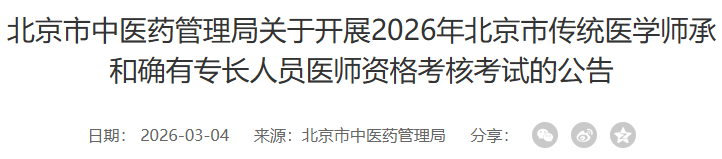 根據(jù)《傳統(tǒng)醫(yī)學(xué)師承和確有專長人員醫(yī)師資格考核考試辦法》(中華人民共和國衛(wèi)生部令第52號)及《北京市傳統(tǒng)醫(yī)學(xué)師承和確有專長人員考核管理辦法》(京中醫(yī)政字〔2016〕147號)要求,現(xiàn)將2026年北京市傳統(tǒng)醫(yī)學(xué)師承和確有專長人員醫(yī)師資格考核考試工作具體事宜公告如下。