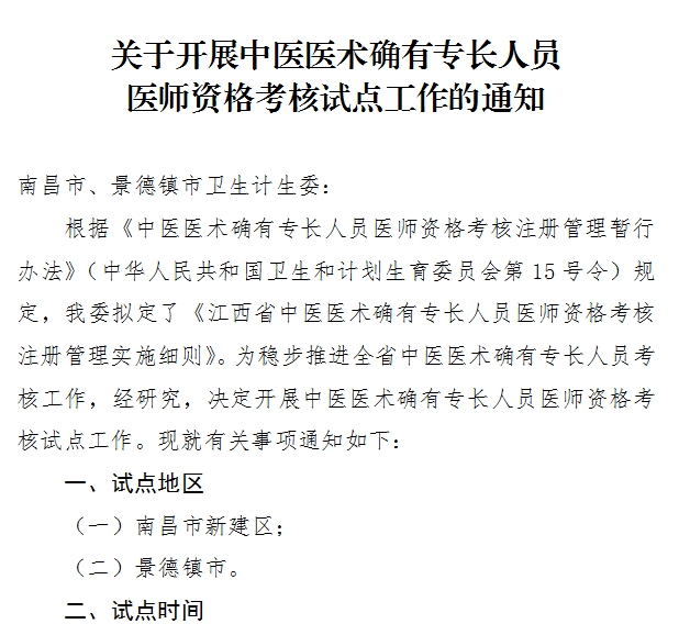 江西省衛(wèi)計委發(fā)布關(guān)于開展中醫(yī)醫(yī)術(shù)確有專長人員醫(yī)師資格考核試點工作的通知,醫(yī)學(xué)教育網(wǎng)小編為您整理解答如下: