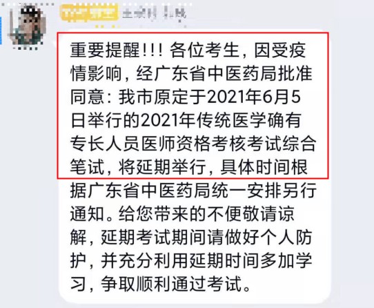 各位考生,因受疫情影響,經(jīng)廣東省中醫(yī)藥局批準(zhǔn)同意:我市原定于2021年6月5日舉行的2021年傳統(tǒng)醫(yī)學(xué)確有專長人員醫(yī)師資格考核考試綜合筆試,將延期舉行,具體時間根據(jù)廣東省中醫(yī)藥局統(tǒng)一安排另行通知。給您帶來的不便敬請諒解,延期考試期間請做好個人防護,并充分利用延期時間多加學(xué)習(xí),爭取順利通過考試。