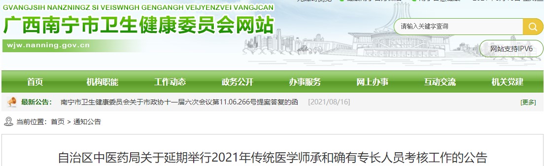 為統(tǒng)籌做好新冠肺炎疫情防控和傳統(tǒng)醫(yī)學師承和確有專長人員考核工作,保障人民群眾健康權(quán)益,確??忌?、考務人員安全和考試安全,原定于2021年8月24日至26日在廣西舉行的傳統(tǒng)醫(yī)學師承和確有專長人員考核延期舉行,具體時間另行通知。