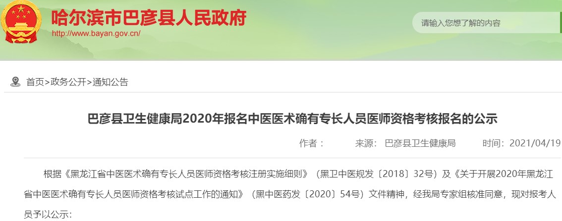 哈爾濱巴彥縣2020年報(bào)名確有專長人員醫(yī)師資格考核報(bào)名的公示已發(fā)布,醫(yī)學(xué)教育網(wǎng)編輯提醒您及時(shí)查看。