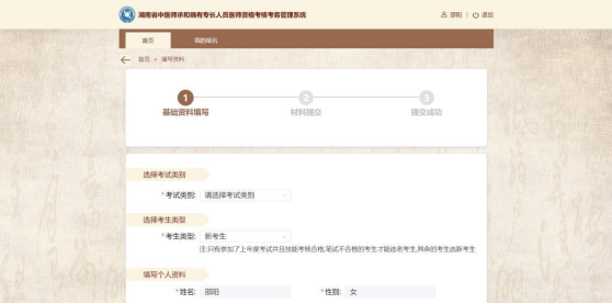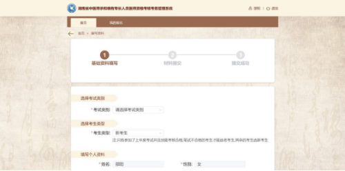 基礎(chǔ)資料主要分為四部分信息:選擇考試類別、選擇考生類型、填寫個(gè)人資料和證件照片。