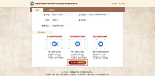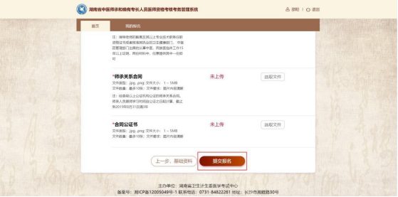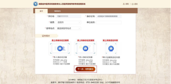 錄入并上傳基礎(chǔ)資料后,點(diǎn)擊該頁(yè)面底部的“下一步,材料提交按鈕”后,進(jìn)入材料提交頁(yè)面。如下圖所示: