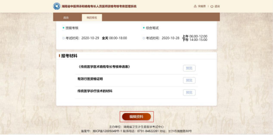 審核分為初審、復(fù)審和終審三個(gè)步驟,初審由市州負(fù)責(zé),復(fù)審和終審由省級(jí)負(fù)責(zé)。考生在市州進(jìn)行現(xiàn)場(chǎng)審核后,如資料不符合要求需補(bǔ)報(bào)材料的,務(wù)必在市州規(guī)定的時(shí)間內(nèi),點(diǎn)擊審核結(jié)果頁(yè)面底部的編輯資料按鈕,按報(bào)名流程上傳補(bǔ)充材料。如下圖所示: