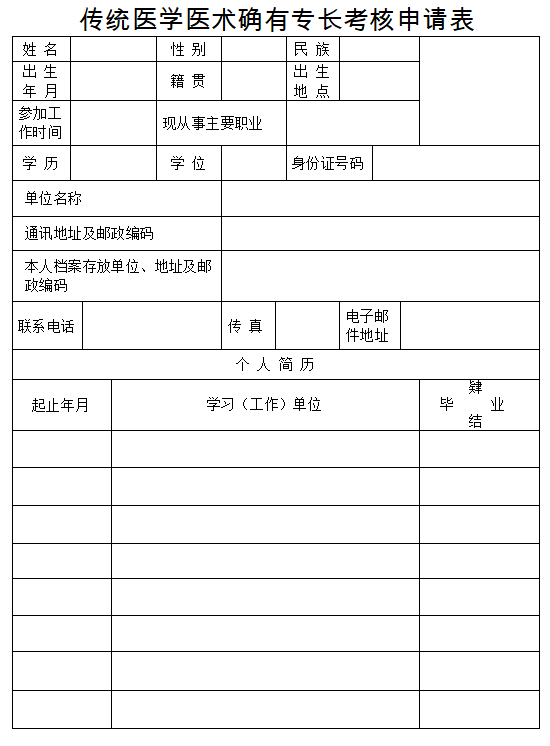 附件:傳統(tǒng)醫(yī)學(xué)醫(yī)術(shù)確有專(zhuān)長(zhǎng)考核申請(qǐng)表下載