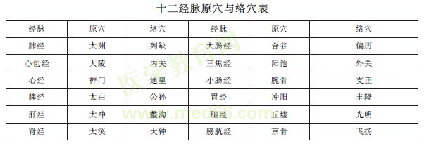 十二經(jīng)脈原穴與絡(luò)穴見下表。