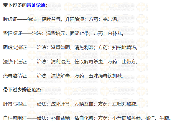 帶下病的治療原則:帶下過多者,治療以除濕為主。帶下過少,治療重在滋補肝腎之陰精,佐以養(yǎng)血、化瘀等。