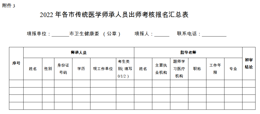 附件下載:2022年各市傳統(tǒng)醫(yī)學(xué)師承人員出師考核報(bào)名匯總表
