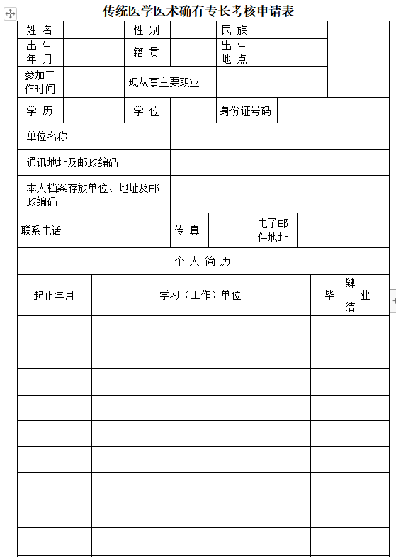 附件下載:傳統(tǒng)醫(yī)學(xué)醫(yī)術(shù)確有專長考核申請表