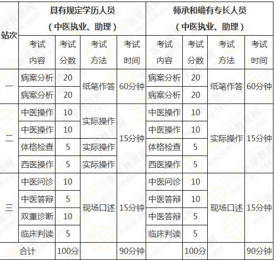 第二,首先通過技能考試,醫(yī)學(xué)考試是先技能,后理論考試,必須先通過臨床技能操作考試,技能通過之后方可進(jìn)行理論知識(shí)考試。技能考試分為兩類人群規(guī)定學(xué)歷和師承考試,考試分為三站,從病案分析到中醫(yī)操作再到西醫(yī)內(nèi)容,對(duì)于沒有經(jīng)過系統(tǒng)醫(yī)學(xué)教育的人而言是有一定難度的(具體分值見附表,附表來(lái)源互聯(lián)網(wǎng))。